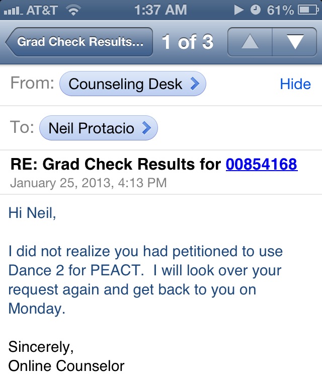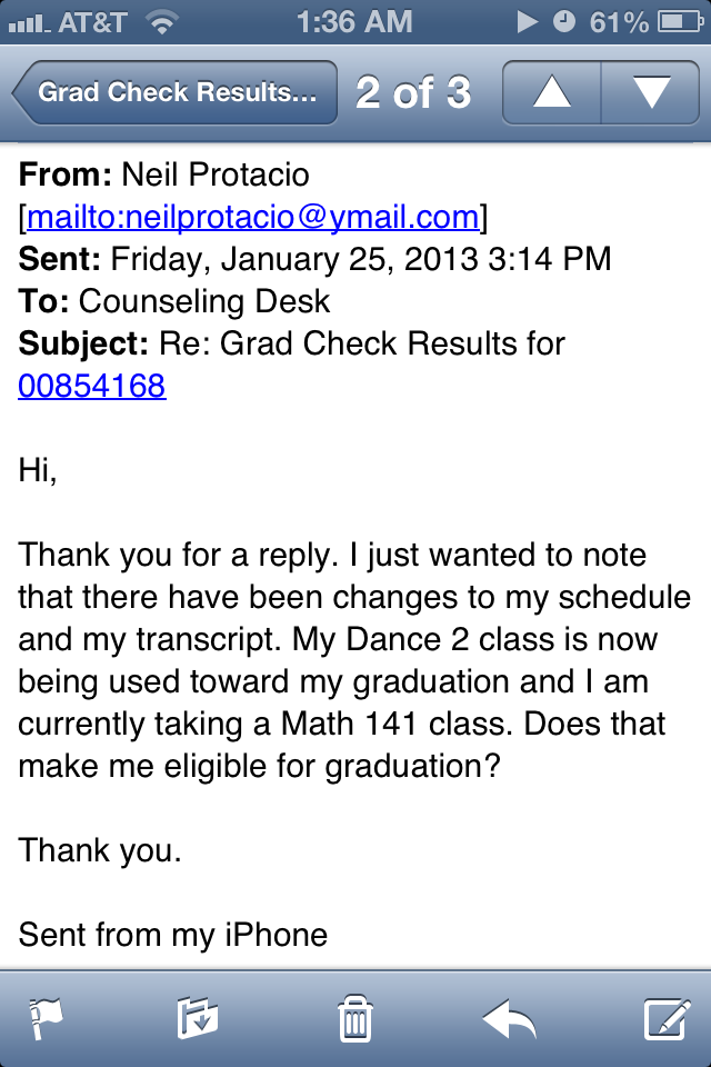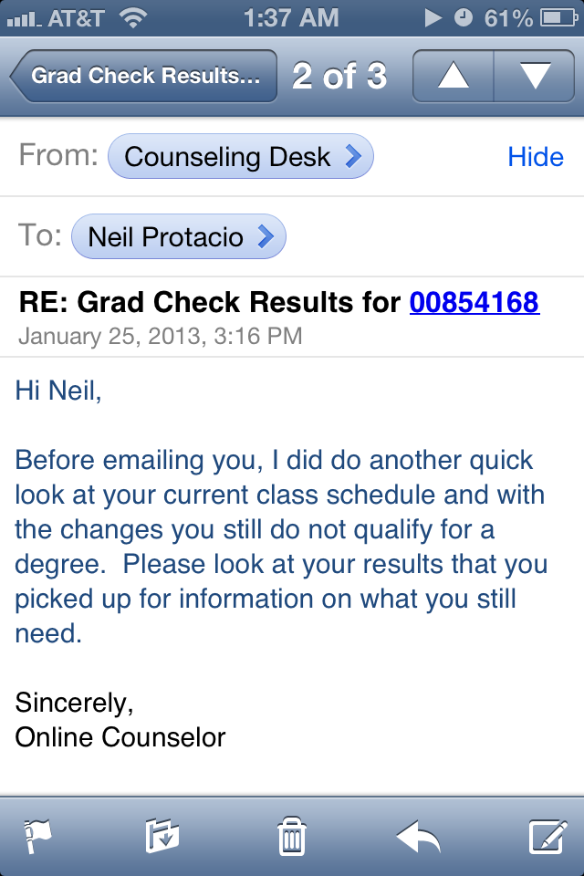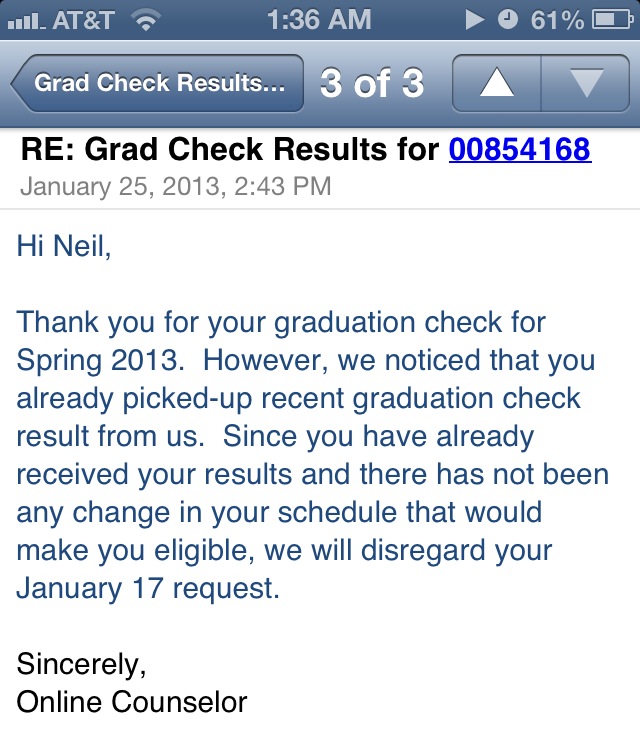A few days later, I decided to send another graduation check, having been able to register for the math class and also having my petition granted. I was expecting a pending notice – which means I would have to pass this semester’s classes in order to graduate. A few days later, an online counselor emailed me back. Here’s the back and forth: