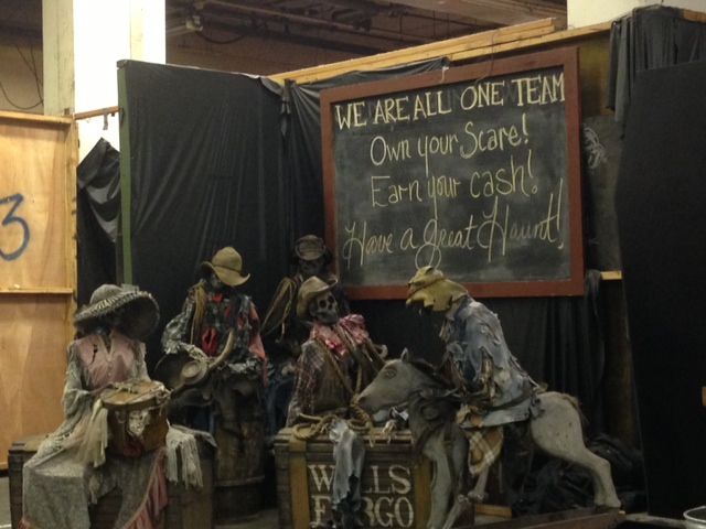 In our lines, we were led backstage near the Ghost Rider roller coaster. We walked around the back a bit and gazed at all the wood work erecting before our very eyes. It kinda seemed surreal that we would be a part of all of this. Just thinking about prowling these mazes got my spirit kicking. Eventually, we were led to a gate that housed a small building. The staffer told us he’d collect our applications, which would basically be our ticket into getting into the building. Stephanie, in a frantic rush, started writing on my back, trying to fill in phone numbers from her past employers. Of course, I panicked and just walked right in, forgetting that Stephanie was using my back as a board. She eventually fell to the back of the line.