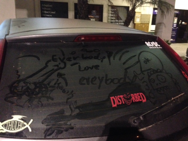 Someone at Denny’s had decided to draw on Kim’s car (it’s dusty because we have to park on a dirt road), so we added to the mural with, you guessed it, more penises.